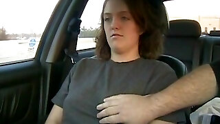 Uber-cute platinum-blonde fucks with a stranger and makes him blowjob in the car