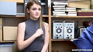 hübscher schlanker teenie-ladendieb lutscht und reitet den ständer des sicherheitsmanns wie ein profi, um die freiheit zu verdienen