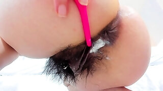 A big white magic wand on a hairy pussy