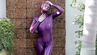 Dame has to walk in latex catsuit on the street because she lost a bet