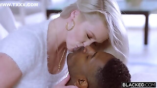 Elegant Ash-blonde MILF seduced a dude for anal spooning on sofa