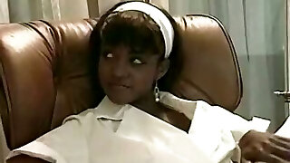 Bosomy black head is horny nurse who wanna expose her smooth-shaven pink slit