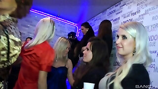 Sweeties are sucking stripper's cock in a bar getting fat cumshots