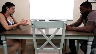 Petite black-haired Liz Jordan got good-sized BBC on a kitchen table